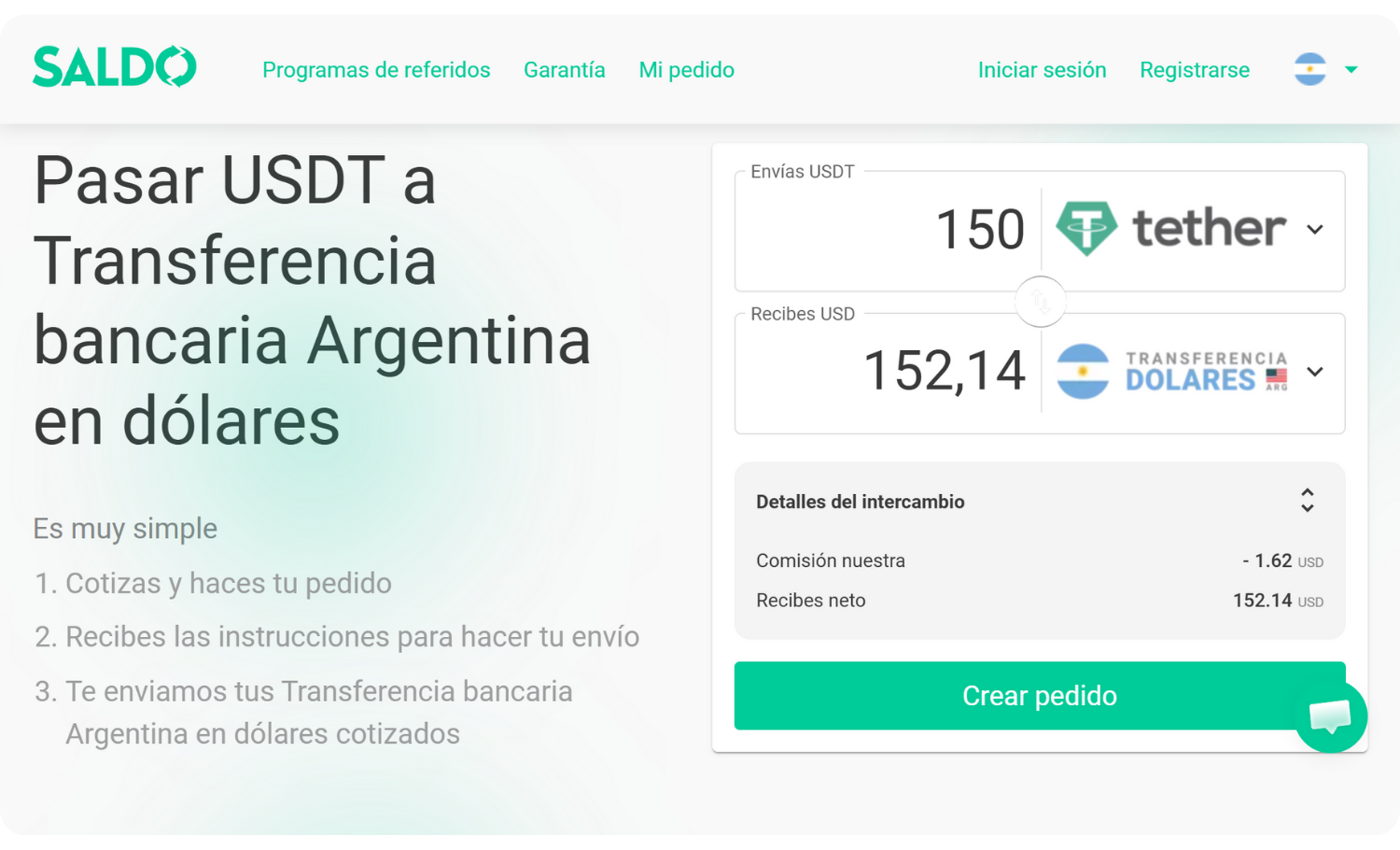 Saldoar permite cambiar USDT por transferencia bancaria en dólares en Argentina, mostrando el resultado final antes de confirmar la conversión. Una gran ventaja porque desde el principio sabes cuánto dinero vas a recibir.