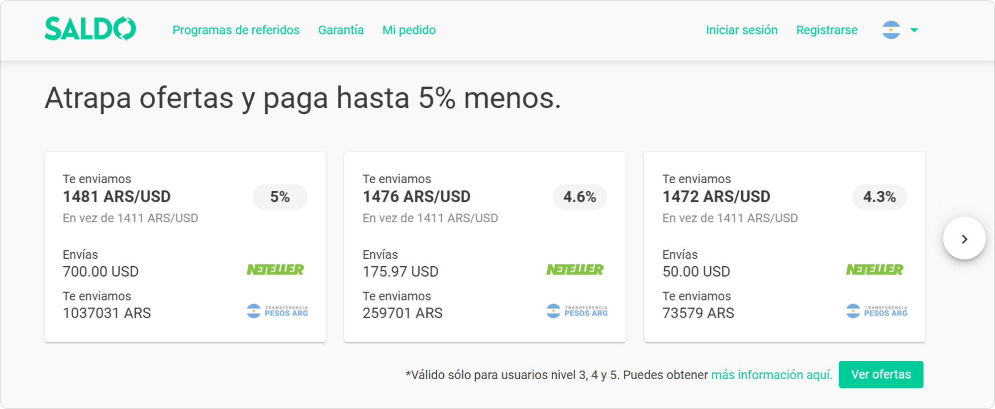 Las ofertas forman parte del sistema de niveles de Saldoar, lo que significa que cuanto más uses la plataforma, más beneficios obtienes.